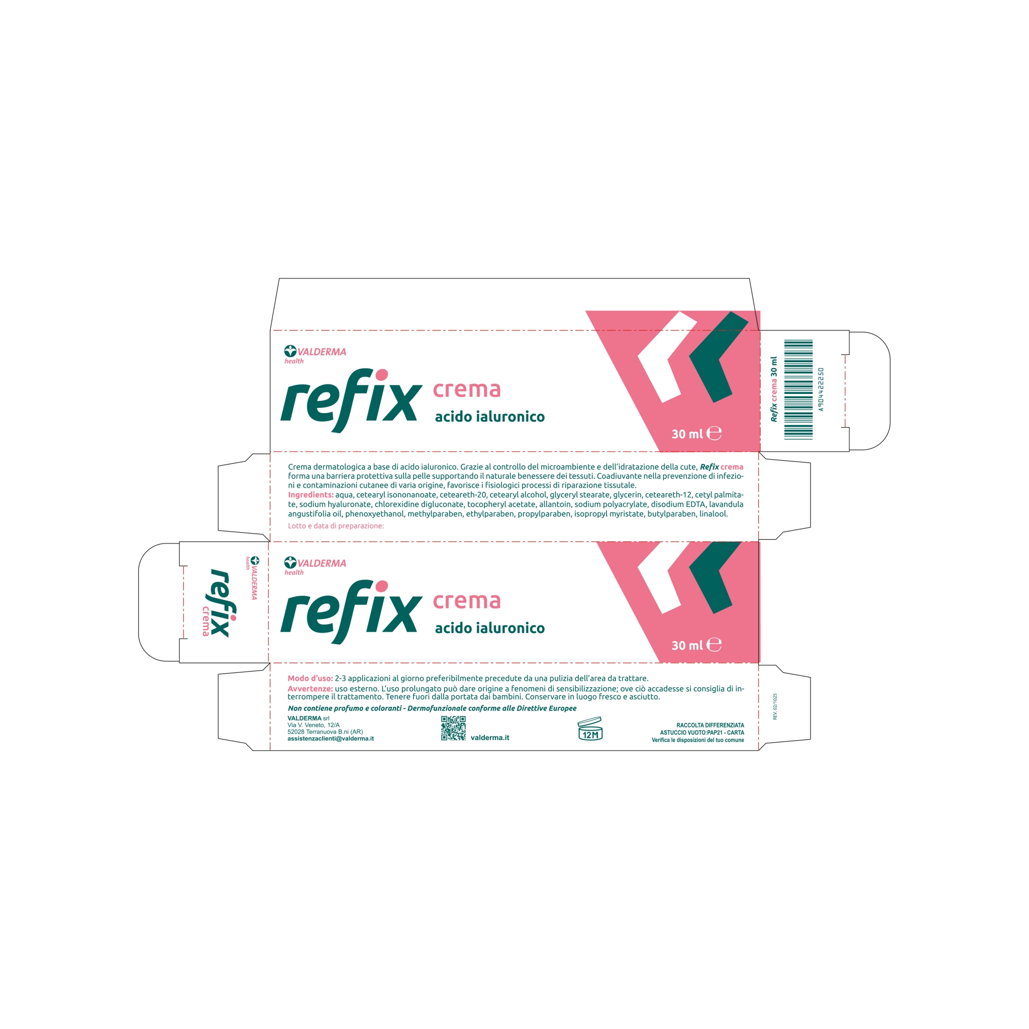 Crema dermatologica a base di acido ialuronico. Grazie al controllo del microambiente e dell’idratazione della cute, Refix crema forma una barriera protettiva sulla pelle supportando il naturale benessere dei tessuti. Coadiuvante nella prevenzione di infezioni e contaminazioni cutanee di varia origine, favorisce i fisiologici processi di riparazione tissutale.